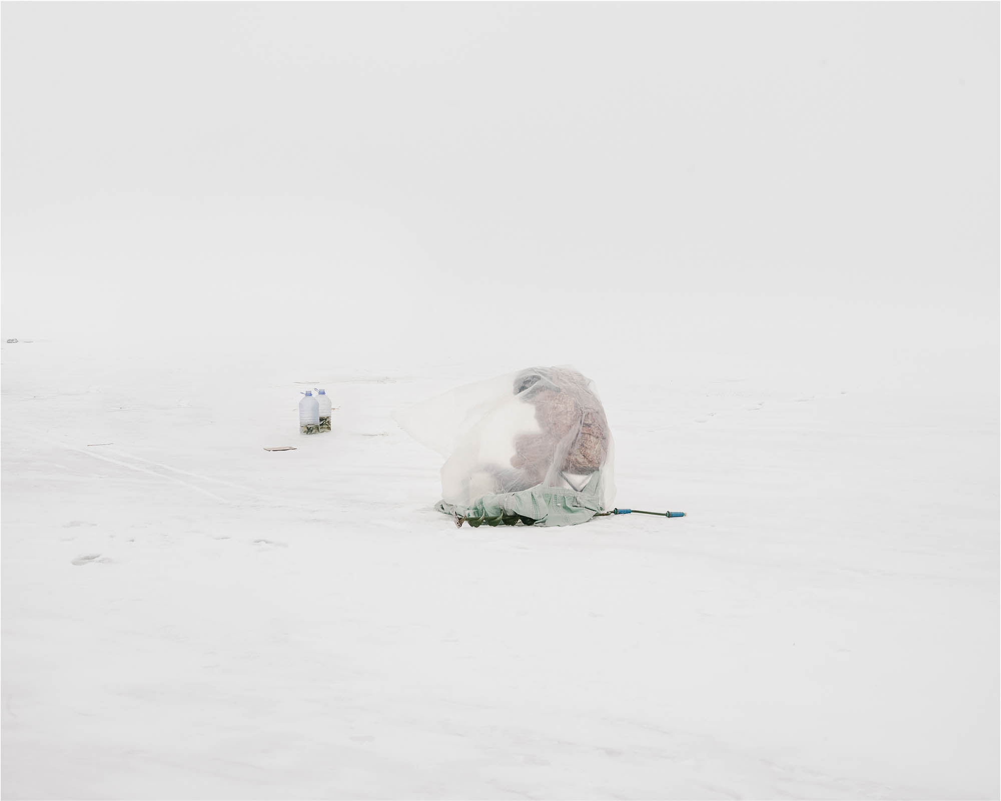 The water that heals and nourishes, but which is also a place for the special therapy – men of the former USSR countries will fish in the frozen waters, to free themselves from daily pressures. It has become a national sport, a hobby and a challenge. The fishermen of Kazakhstan, photographed by Aleksey Kondratyev as ghosts under plastic sheeting, who operate in the extreme cold, cut themselves off from the world, with their supplies on hand, similar to cosmonauts on other planet.